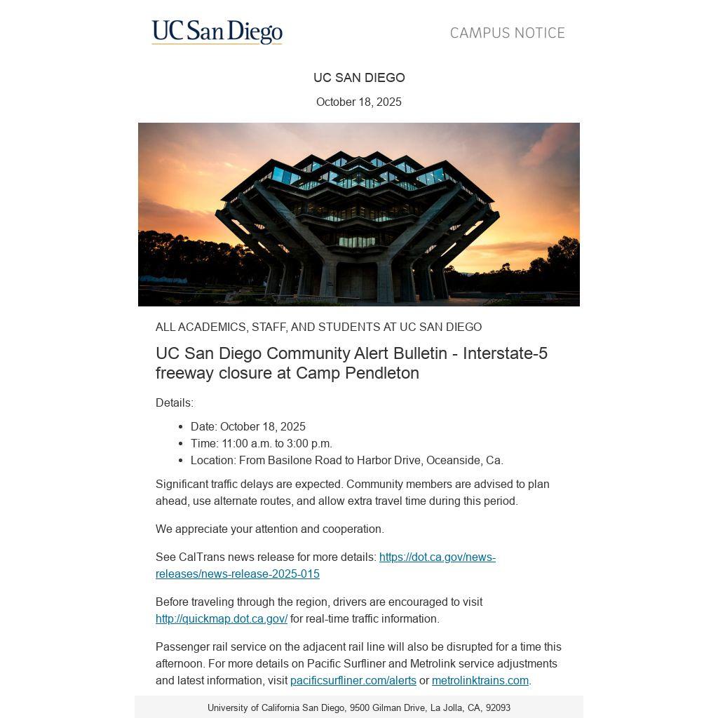 Passenger rail service on the adjacent rail line will also be disrupted for a time this afternoon. For more details on Pacific Surfliner and Metrolink service adjustments and latest information, visit pacificsurfliner.com/alerts or metrolinktrains.com.