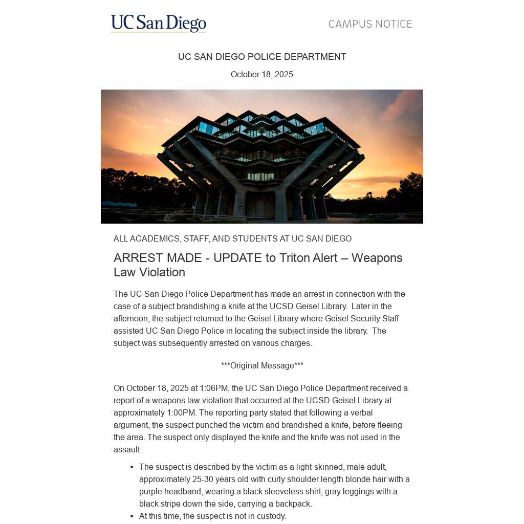 On October 18, 2025 at 1:06PM, the UC San Diego Police Department received a report of a weapons law violation that occurred at the UCSD Geisel Library at approximately 1:00PM. The reporting party stated that following a verbal argument, the suspect punched the victim and brandished a knife, before fleeing the area. The suspect only displayed the knife and the knife was not used in the assault.