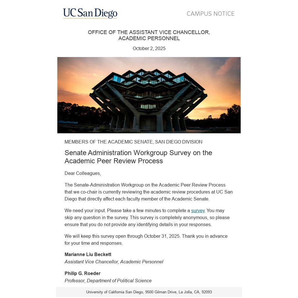 The Senate-Administration Workgroup on the Academic Peer Review Process that we co-chair is currently reviewing the academic review procedures at UC San Diego that directly affect each faculty member of the Academic Senate.