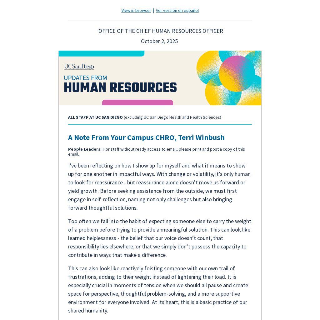 People Leaders on campus, join us on Tuesday, October 21 from 10 – 11:30 a.m. for the second of two webinars in the series “Change, Community, and Agency” - a focused conversation for employees navigating ongoing uncertainty in the workplace. In part one, we explored how to foster stability and cohesion amid disruption. Part two shifts the focus inward, offering strategies for career growth, upskilling, and reclaiming agency in the face of evolving professional demands. Together, we’ll discuss how to lead with resilience, support others through transformation, and build strength in the midst of change. Register on Zoom.