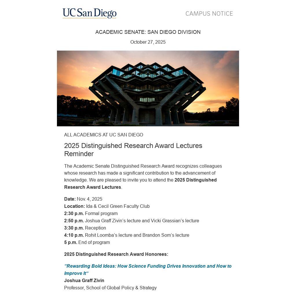 The Academic Senate Distinguished Research Award recognizes colleagues whose research has made a significant contribution to the advancement of knowledge. We are pleased to invite you to attend the 2025 Distinguished Research Award Lectures.