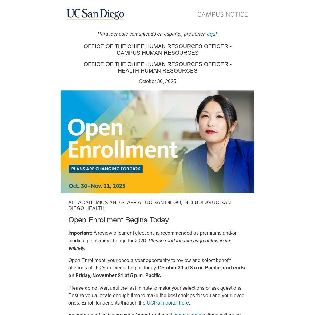 Open Enrollment, your once-a-year opportunity to review and select benefit offerings at UC San Diego, begins today, October 30 at 8 a.m. Pacific, and ends on Friday, November 21 at 5 p.m. Pacific.