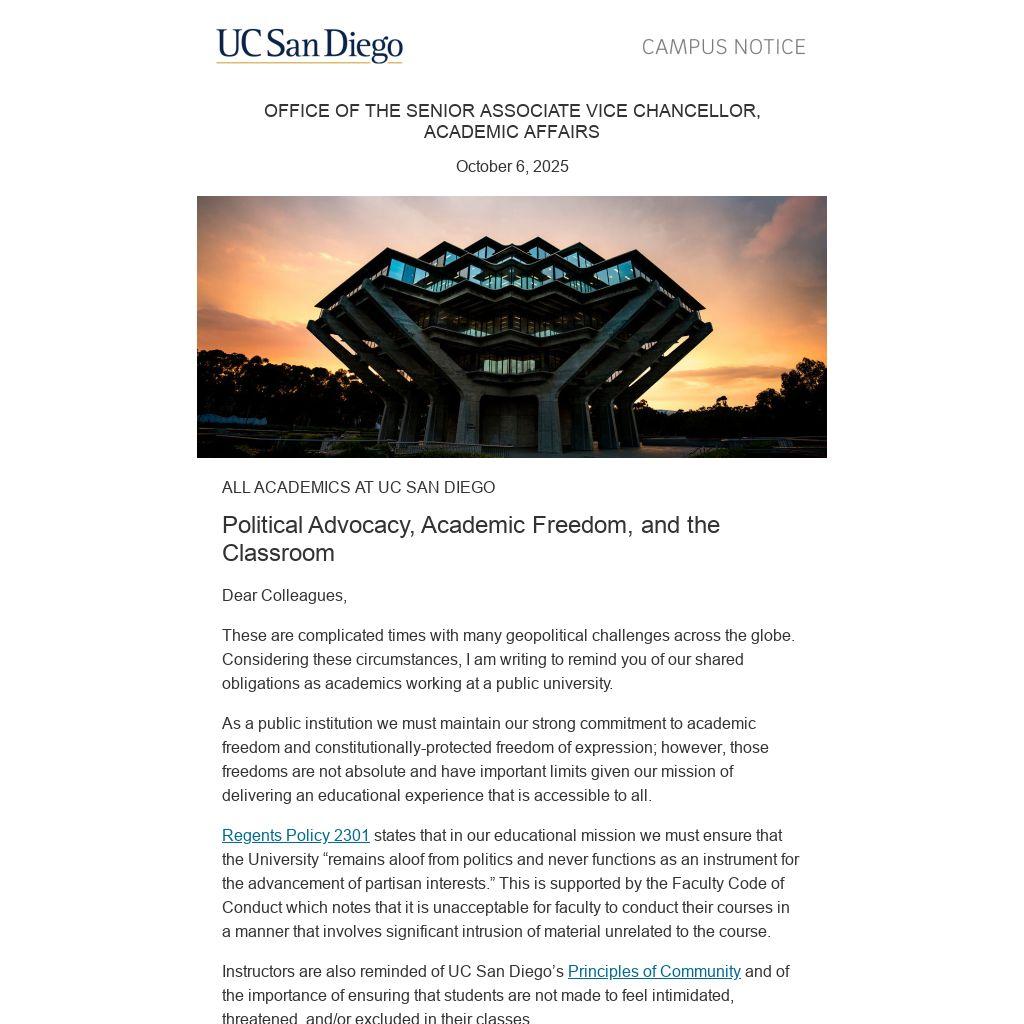 Regents Policy 2301 states that in our educational mission we must ensure that the University “remains aloof from politics and never functions as an instrument for the advancement of partisan interests.” This is supported by the Faculty Code of Conduct which notes that it is unacceptable for faculty to conduct their courses in a manner that involves significant intrusion of material unrelated to the course.