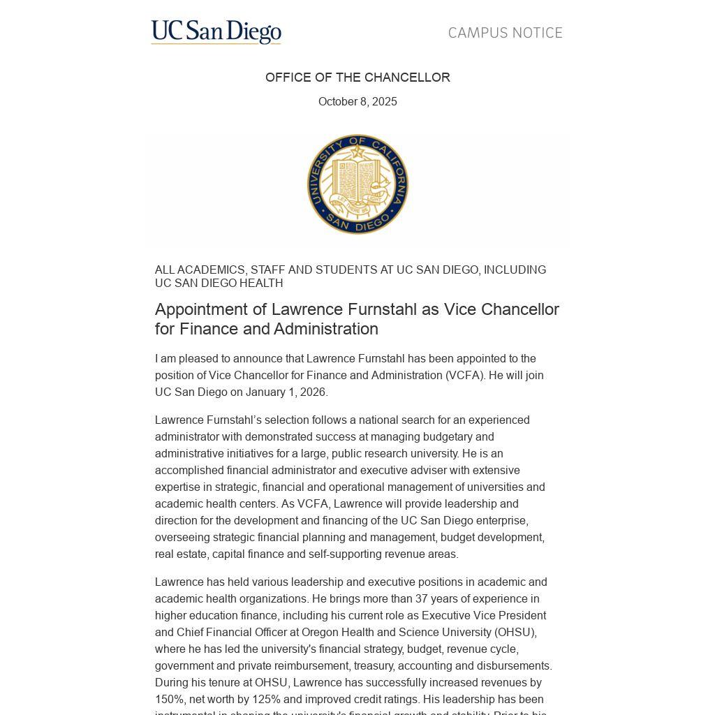 I am pleased to announce that Lawrence Furnstahl has been appointed to the position of Vice Chancellor for Finance and Administration (VCFA). He will join UC San Diego on January 1, 2026.