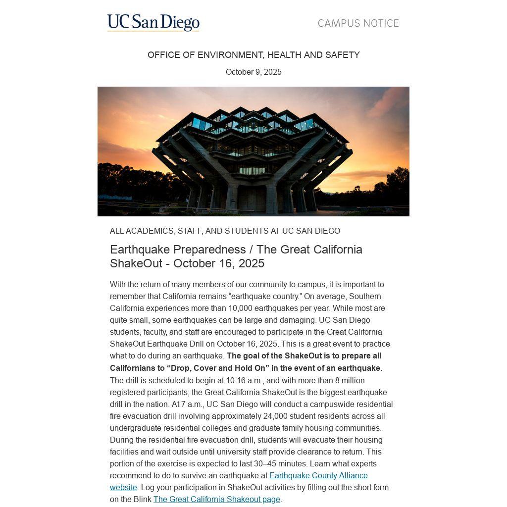 With the return of many members of our community to campus, it is important to remember that California remains “earthquake country.” On average, Southern California experiences more than 10,000 earthquakes per year. While most are quite small, some earthquakes can be large and damaging. UC San Diego students, faculty, and staff are encouraged to participate in the Great California ShakeOut Earthquake Drill on October 16, 2025. This is a great event to practice what to do during an earthquake. The goal of the ShakeOut is to prepare all Californians to “Drop, Cover and Hold On” in the event of an earthquake. The drill is scheduled to begin at 10:16 a.m., and with more than 8 million registered participants, the Great California ShakeOut is the biggest earthquake drill in the nation. At 7 a.m., UC San Diego will conduct a campuswide residential fire evacuation drill involving approximately 24,000 student residents across all undergraduate residential colleges and graduate family housing communities. During the residential fire evacuation drill, students will evacuate their housing facilities and wait outside until university staff provide clearance to return. This portion of the exercise is expected to last 30–45 minutes. Learn what experts recommend to do to survive an earthquake at Earthquake County Alliance website. Log your participation in ShakeOut activities by filling out the short form on the Blink The Great California Shakeout page.
