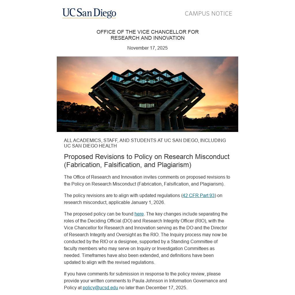 If you have comments for submission in response to the policy review, please provide your written comments to Paula Johnson in Information Governance and Policy at policy@ucsd.edu no later than December 17, 2025.