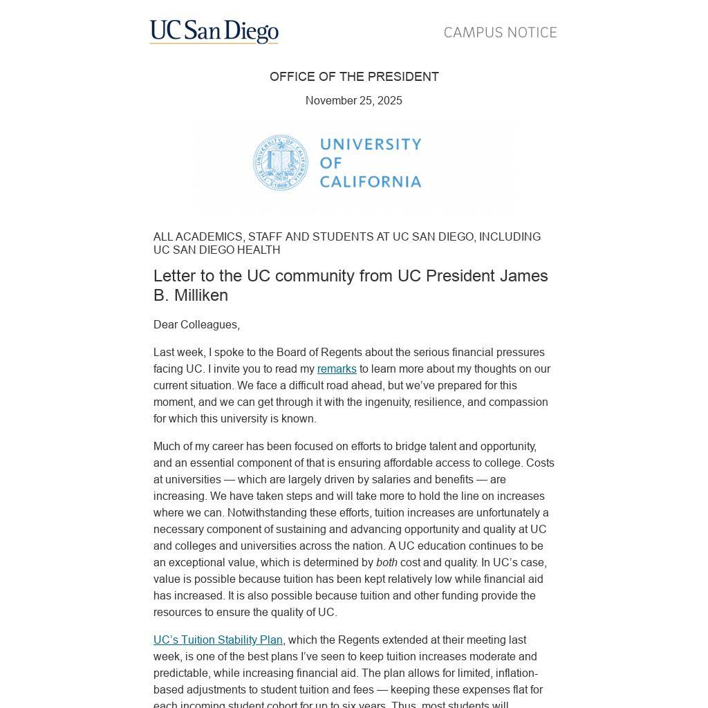 This is a challenging time for higher education, and managing it will not be easy. In the coming weeks, we will share more about how we will meet the challenges UC is facing. As we continue the essential work of providing opportunity, offering the highest quality education, supporting the best research and discovery, and serving the people of California, please know how grateful I am for the commitment and contributions you bring to UC.
