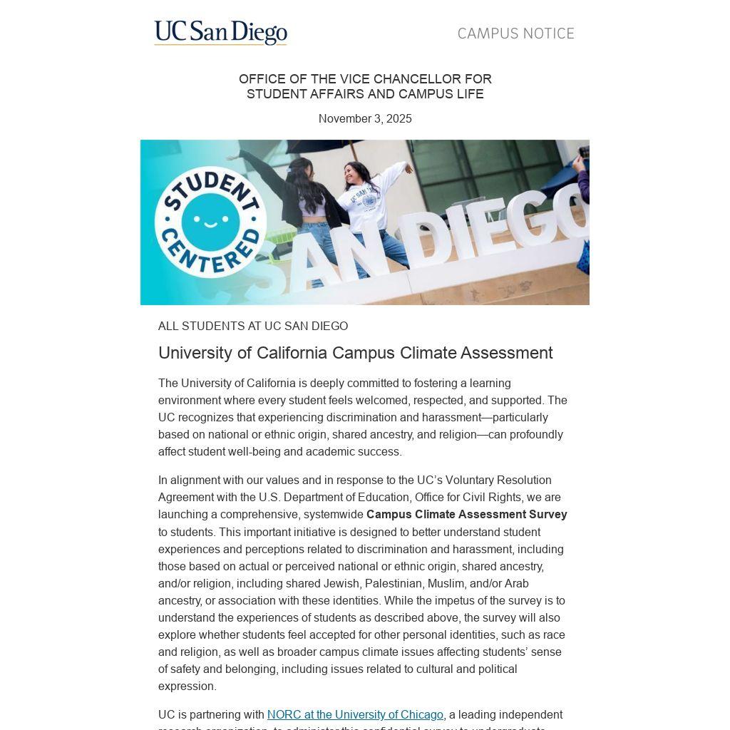 In alignment with our values and in response to the UC’s Voluntary Resolution Agreement with the U.S. Department of Education, Office for Civil Rights, we are launching a comprehensive, systemwide Campus Climate Assessment Survey to students. This important initiative is designed to better understand student experiences and perceptions related to discrimination and harassment, including those based on actual or perceived national or ethnic origin, shared ancestry, and/or religion, including shared Jewish, Palestinian, Muslim, and/or Arab ancestry, or association with these identities. While the impetus of the survey is to understand the experiences of students as described above, the survey will also explore whether students feel accepted for other personal identities, such as race and religion, as well as broader campus climate issues affecting students’ sense of safety and belonging, including issues related to cultural and political expression.
