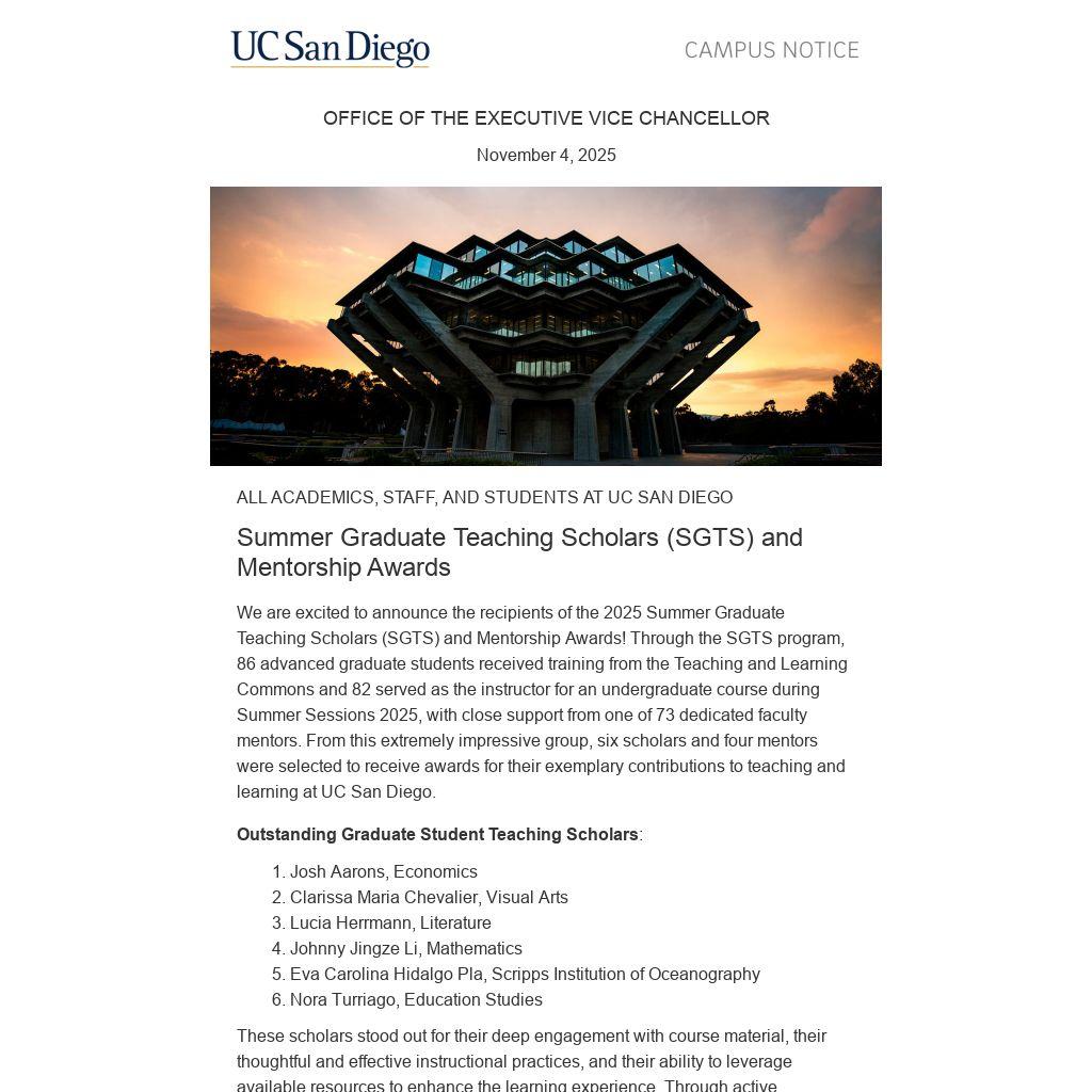 We are excited to announce the recipients of the 2025 Summer Graduate Teaching Scholars (SGTS) and Mentorship Awards! Through the SGTS program, 86 advanced graduate students received training from the Teaching and Learning Commons and 82 served as the instructor for an undergraduate course during Summer Sessions 2025, with close support from one of 73 dedicated faculty mentors. From this extremely impressive group, six scholars and four mentors were selected to receive awards for their exemplary contributions to teaching and learning at UC San Diego.