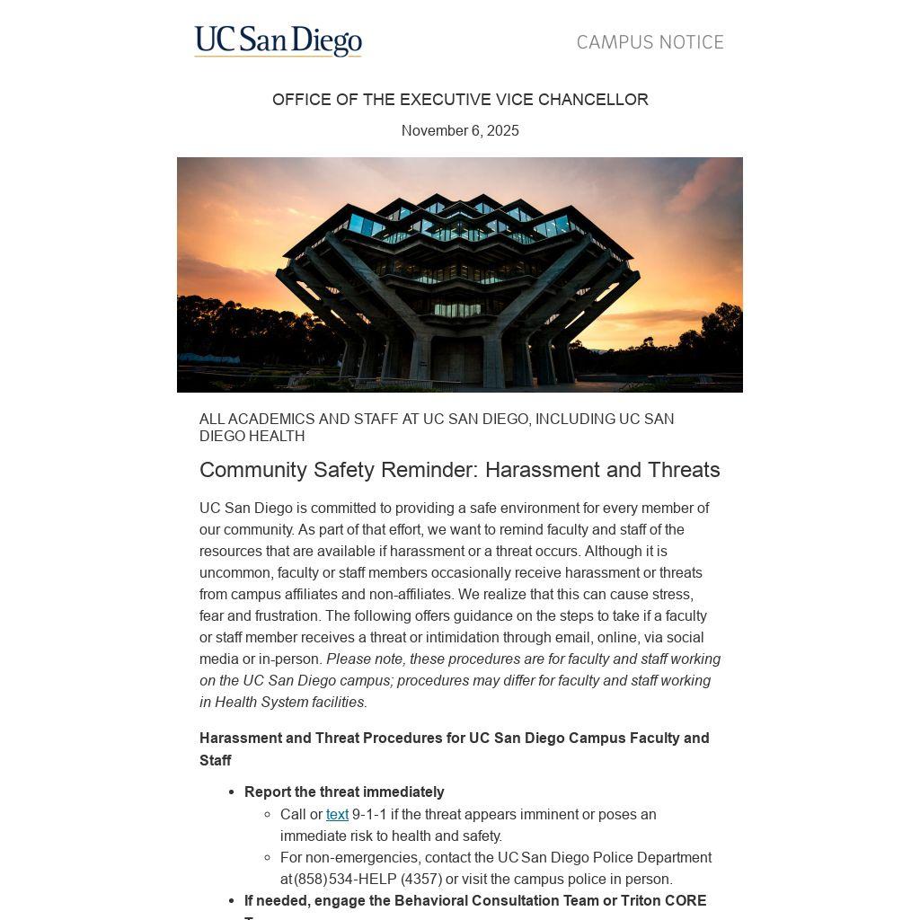 UC San Diego is committed to providing a safe environment for every member of our community. As part of that effort, we want to remind faculty and staff of the resources that are available if harassment or a threat occurs. Although it is uncommon, faculty or staff members occasionally receive harassment or threats from campus affiliates and non-affiliates. We realize that this can cause stress, fear and frustration. The following offers guidance on the steps to take if a faculty or staff member receives a threat or intimidation through email, online, via social media or in-person. Please note, these procedures are for faculty and staff working on the UC San Diego campus; procedures may differ for faculty and staff working in Health System facilities.