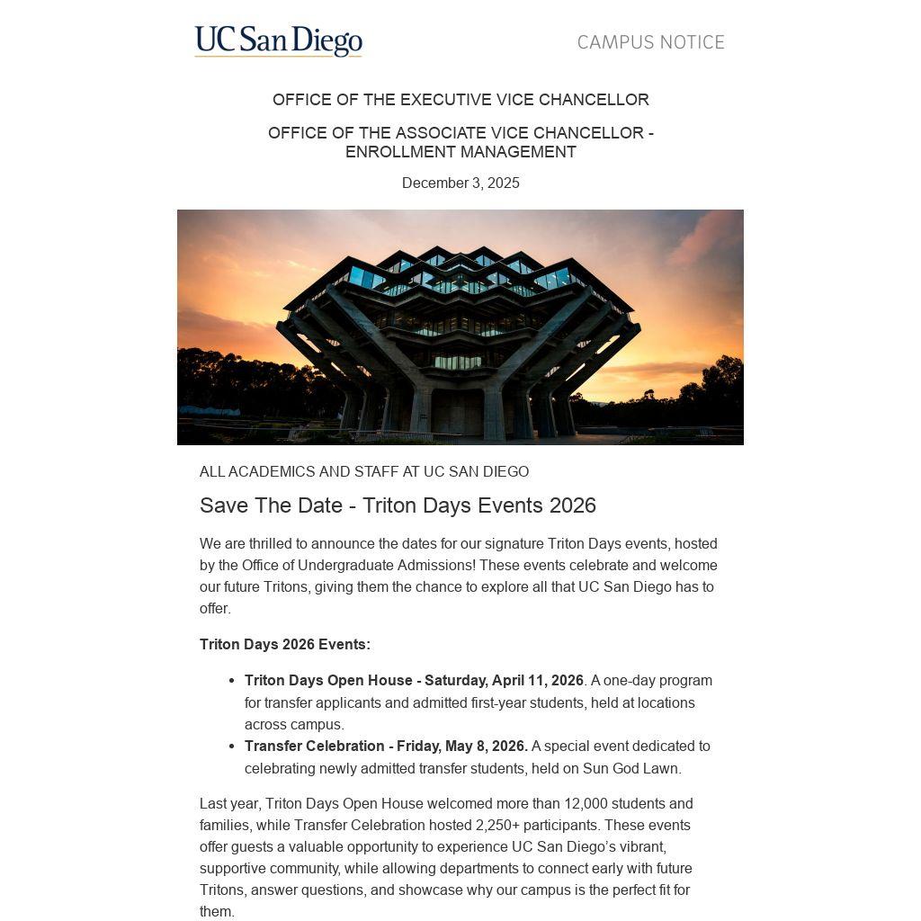 We encourage all departments to participate in both events. The participation form will be open Wednesday, Jan. 7 – Wednesday, Feb. 4, 2026. Please note that late submissions will not be accepted, so be sure to complete your registration before the deadline. To learn more, visit our Triton Days webpage.