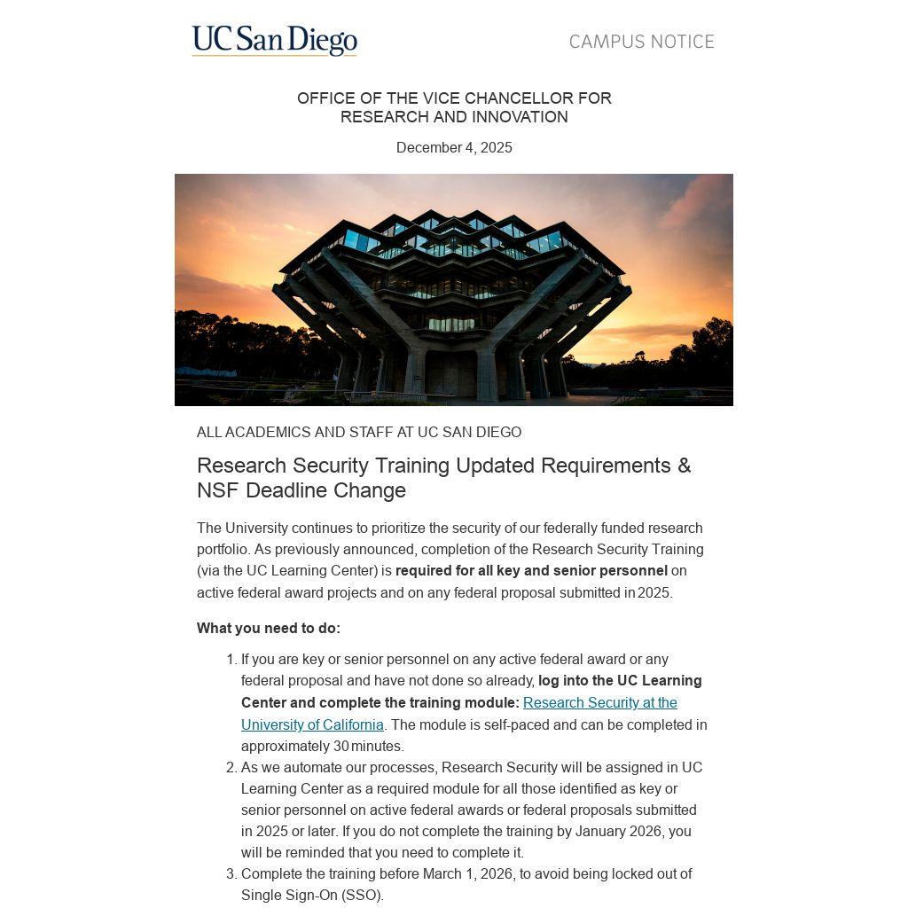 The University continues to prioritize the security of our federally funded research portfolio. As previously announced, completion of the Research Security Training (via the UC Learning Center) is required for all key and senior personnel on active federal award projects and on any federal proposal submitted in 2025.