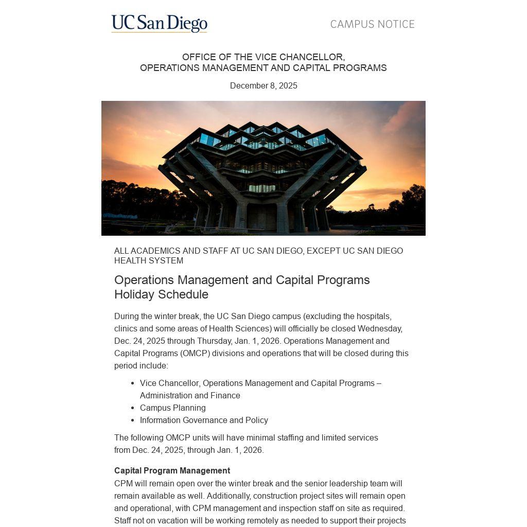 The Central Utilities Plant will be staffed and remain operational for the duration of the closure and will be supporting campus emergency and maintenance services at (858) 534-3250.