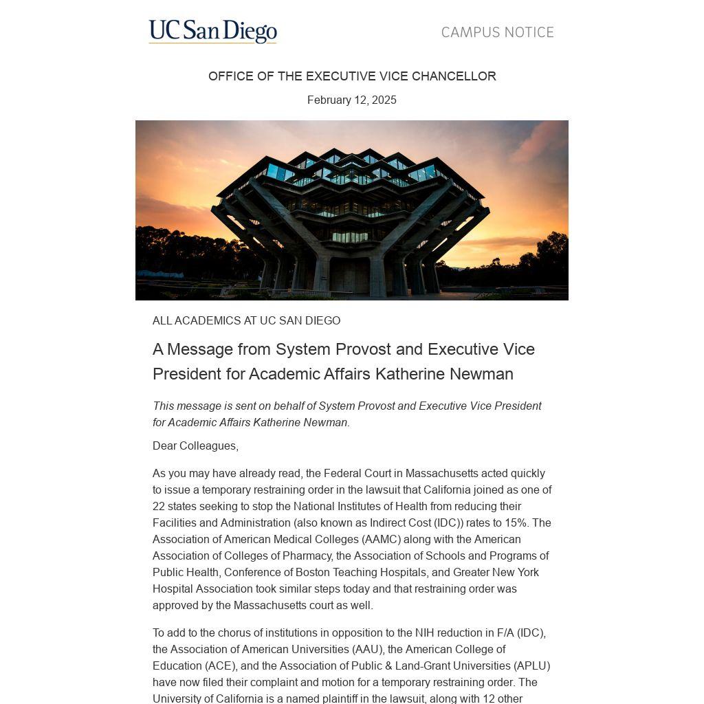 As you may have already read, the Federal Court in Massachusetts acted quickly to issue a temporary restraining order in the lawsuit that California joined as one of 22 states seeking to stop the National Institutes of Health from reducing their Facilities and Administration (also known as Indirect Cost (IDC)) rates to 15%. The Association of American Medical Colleges (AAMC) along with the American Association of Colleges of Pharmacy, the Association of Schools and Programs of Public Health, Conference of Boston Teaching Hospitals, and Greater New York Hospital Association took similar steps today and that restraining order was approved by the Massachusetts court as well.