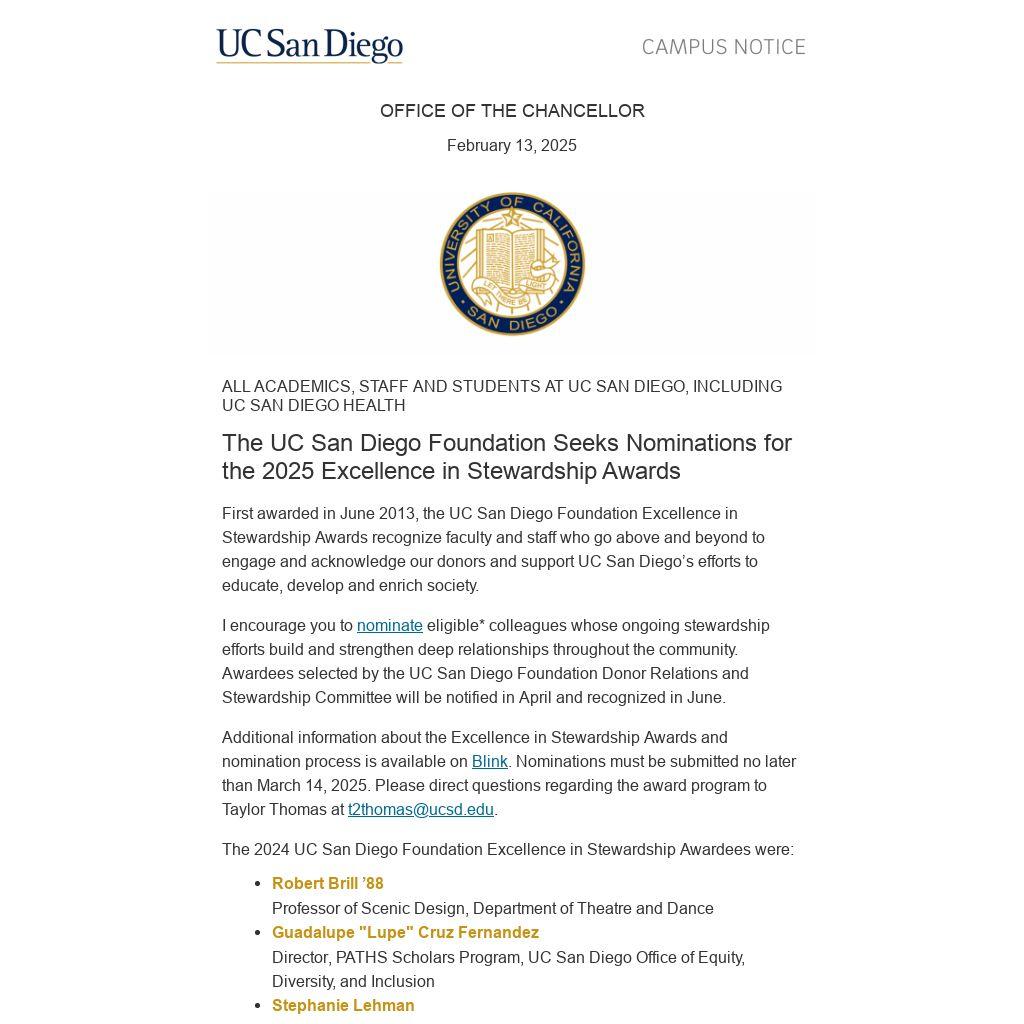 Additional information about the Excellence in Stewardship Awards and nomination process is available on Blink. Nominations must be submitted no later than March 14, 2025. Please direct questions regarding the award program to Taylor Thomas at t2thomas@ucsd.edu.