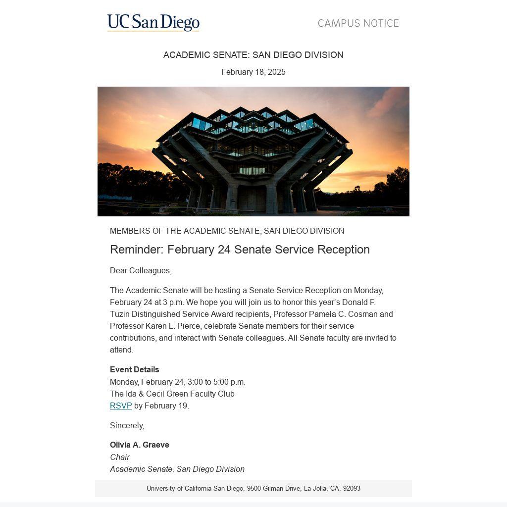 The Academic Senate will be hosting a Senate Service Reception on Monday, February 24 at 3 p.m. We hope you will join us to honor this year’s Donald F. Tuzin Distinguished Service Award recipients, Professor Pamela C. Cosman and Professor Karen L. Pierce, celebrate Senate members for their service contributions, and interact with Senate colleagues. All Senate faculty are invited to attend.