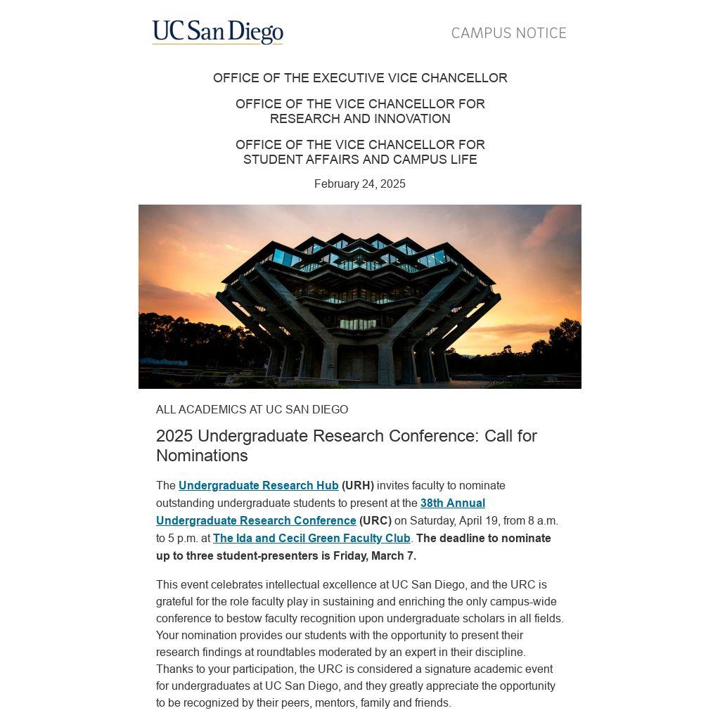 Your participation as a nominator, moderator, and/or attendee at this distinctive and welcoming academic gathering provides vital support to the prestige of undergraduate research at UC San Diego, and we appreciate your encouragement of this valuable program.
