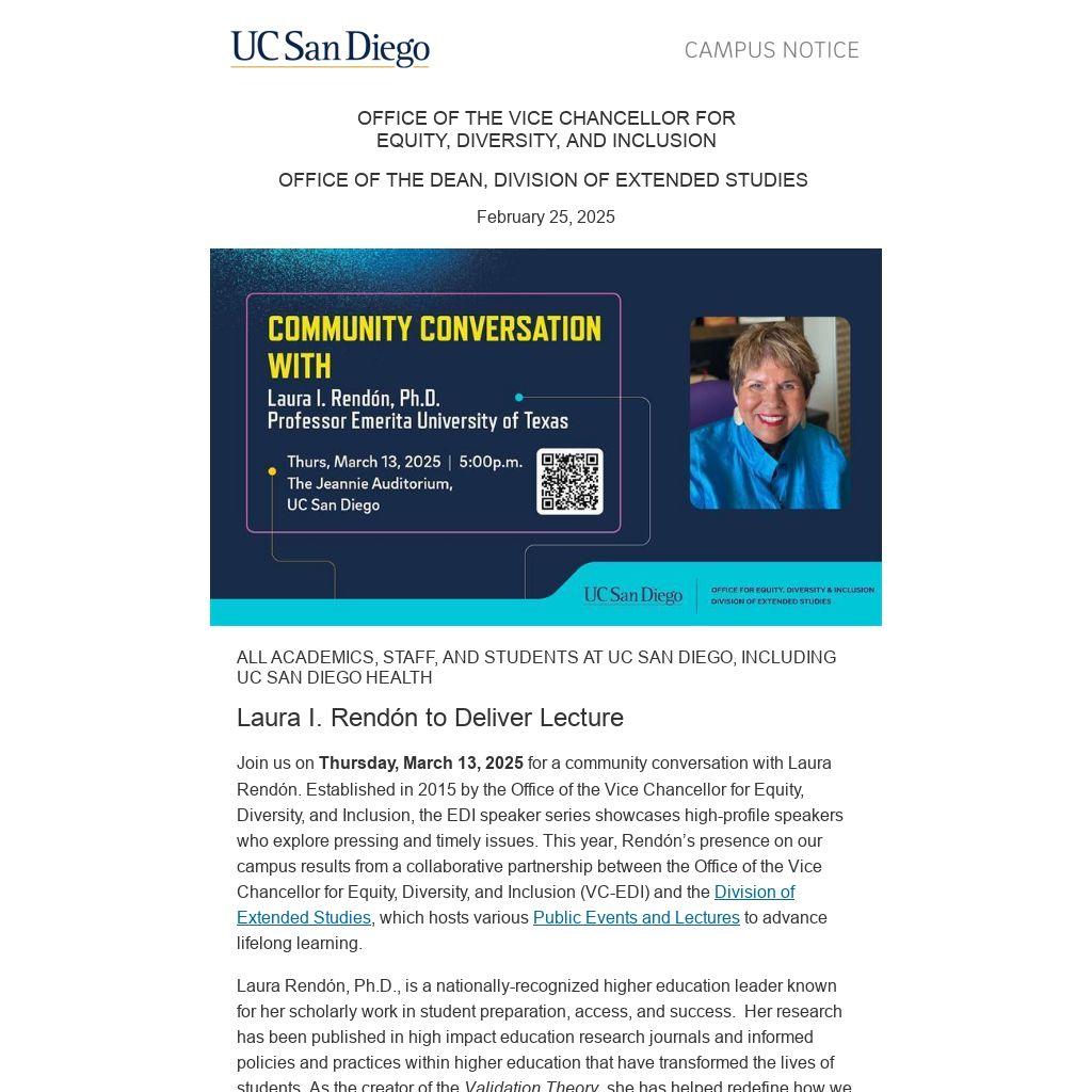 Join us on Thursday, March 13, 2025 for a community conversation with Laura Rendón. Established in 2015 by the Office of the Vice Chancellor for Equity, Diversity, and Inclusion, the EDI speaker series showcases high-profile speakers who explore pressing and timely issues. This year, Rendón’s presence on our campus results from a collaborative partnership between the Office of the Vice Chancellor for Equity, Diversity, and Inclusion (VC-EDI) and the Division of Extended Studies, which hosts various Public Events and Lectures to advance lifelong learning.