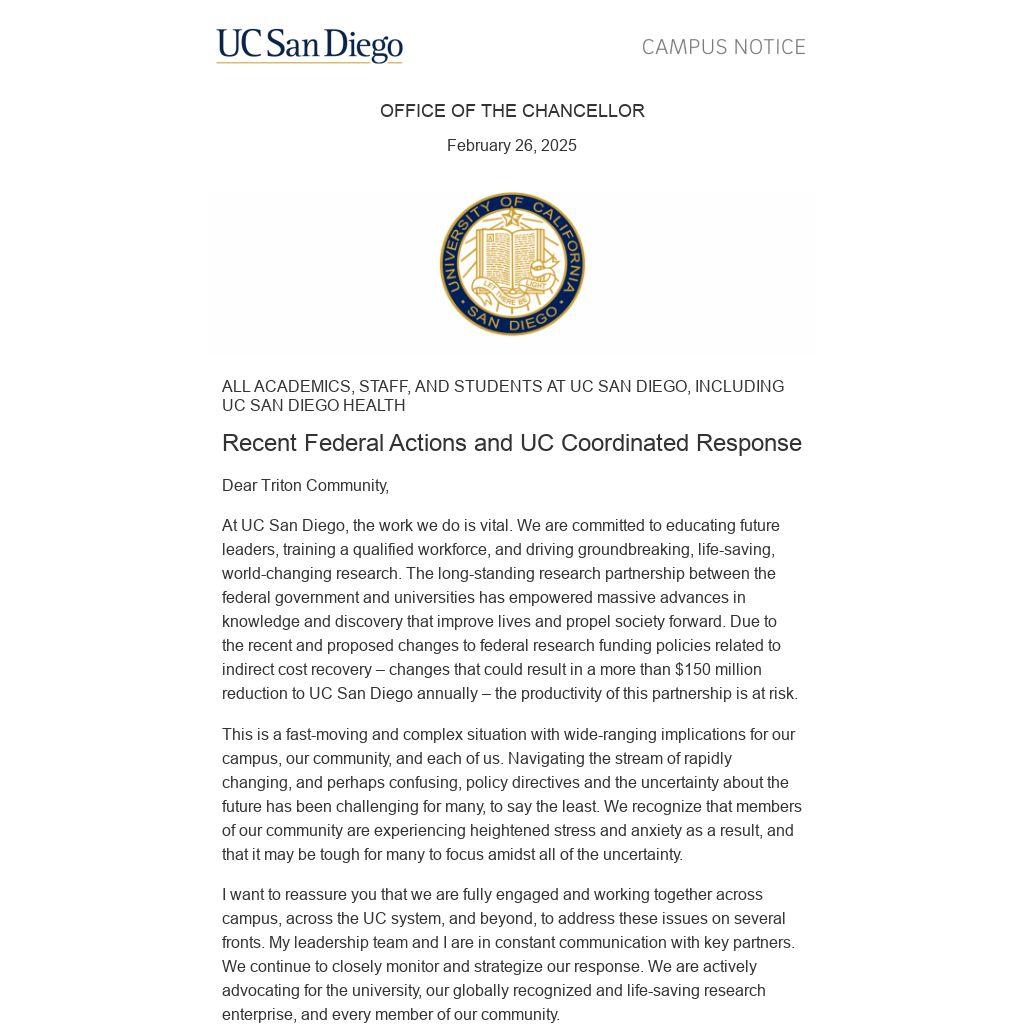 I want to reassure you that we are fully engaged and working together across campus, across the UC system, and beyond, to address these issues on several fronts. My leadership team and I are in constant communication with key partners. We continue to closely monitor and strategize our response. We are actively advocating for the university, our globally recognized and life-saving research enterprise, and every member of our community.