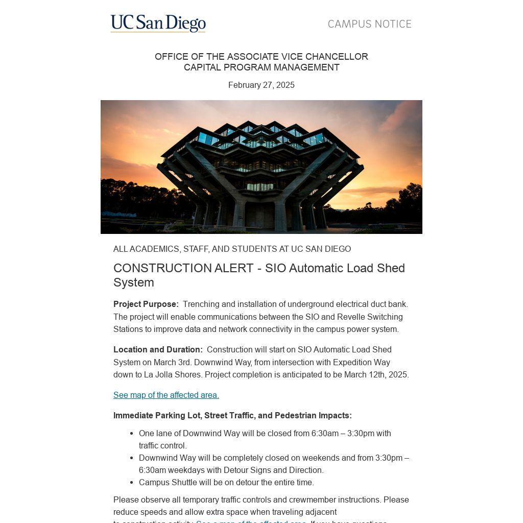 Location and Duration: Construction will start on SIO Automatic Load Shed System on March 3rd. Downwind Way, from intersection with Expedition Way down to La Jolla Shores. Project completion is anticipated to be March 12th, 2025.