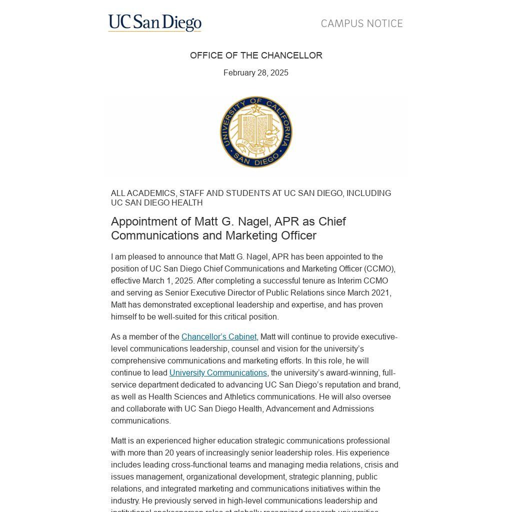 I am pleased to announce that Matt G. Nagel, APR has been appointed to the position of UC San Diego Chief Communications and Marketing Officer (CCMO), effective March 1, 2025. After completing a successful tenure as Interim CCMO and serving as Senior Executive Director of Public Relations since March 2021, Matt has demonstrated exceptional leadership and expertise, and has proven himself to be well-suited for this critical position.