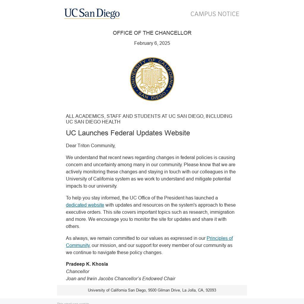 We understand that recent news regarding changes in federal policies is causing concern and uncertainty among many in our community. Please know that we are actively monitoring these changes and staying in touch with our colleagues in the University of California system as we work to understand and mitigate potential impacts to our university.