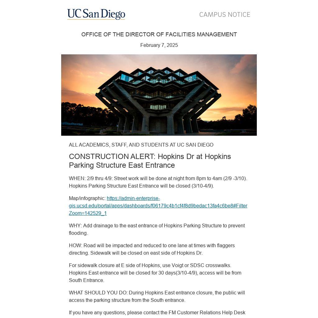 For sidewalk closure at E side of Hopkins, use Voigt or SDSC crosswalks. Hopkins East entrance will be closed for 30 days(3/10-4/9), access will be from South Entrance.