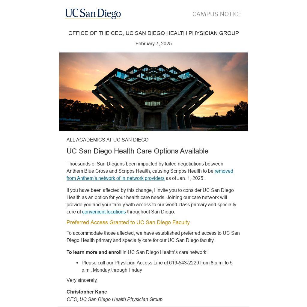 If you have been affected by this change, I invite you to consider UC San Diego Health as an option for your health care needs. Joining our care network will provide you and your family with access to our world-class primary and specialty care at convenient locations throughout San Diego.