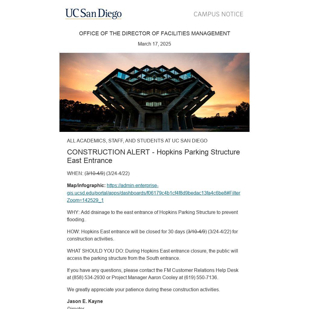 HOW: Hopkins East entrance will be closed for 30 days (3/10-4/9) (3/24-4/22) for construction activities.