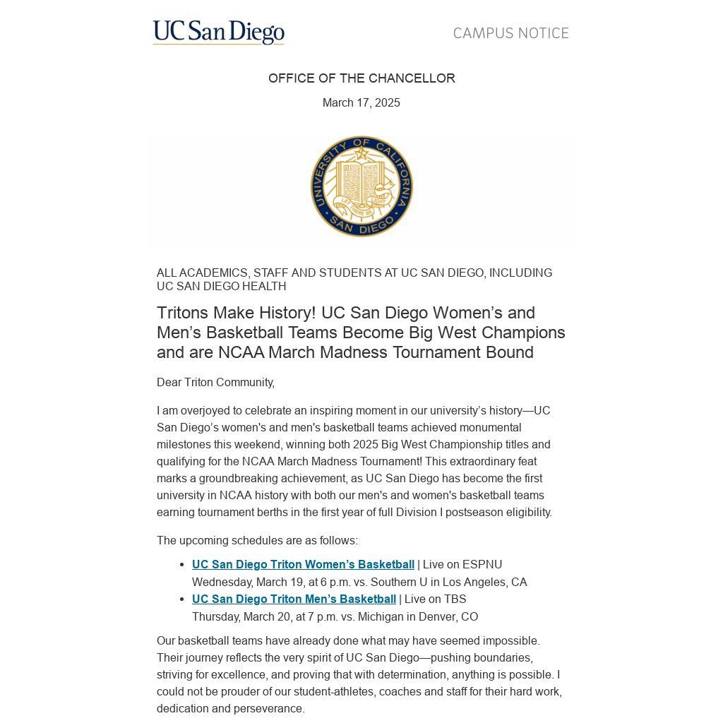 As we prepare to cheer on our Triton teams in the NCAA Tournament, I invite you to join me in celebrating these historic achievements. Whether you are planning watch parties with friends, wearing Triton blue and gold, or simply sharing the pride in what our teams have accomplished, let’s all come together to show support for our phenomenal scholar-athletes who have made history and continue to make UC San Diego proud.