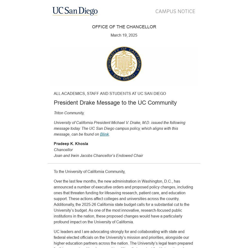 I recognize this is a time of great uncertainty for many in our UC community and in higher education across the country. Throughout our history as an institution and as a nation, we have weathered struggles and found new ways to show up for the people we serve. We will address these challenges, together. I have tremendous confidence in the team that is working on these issues, and in the dedication of our students, faculty, and staff.