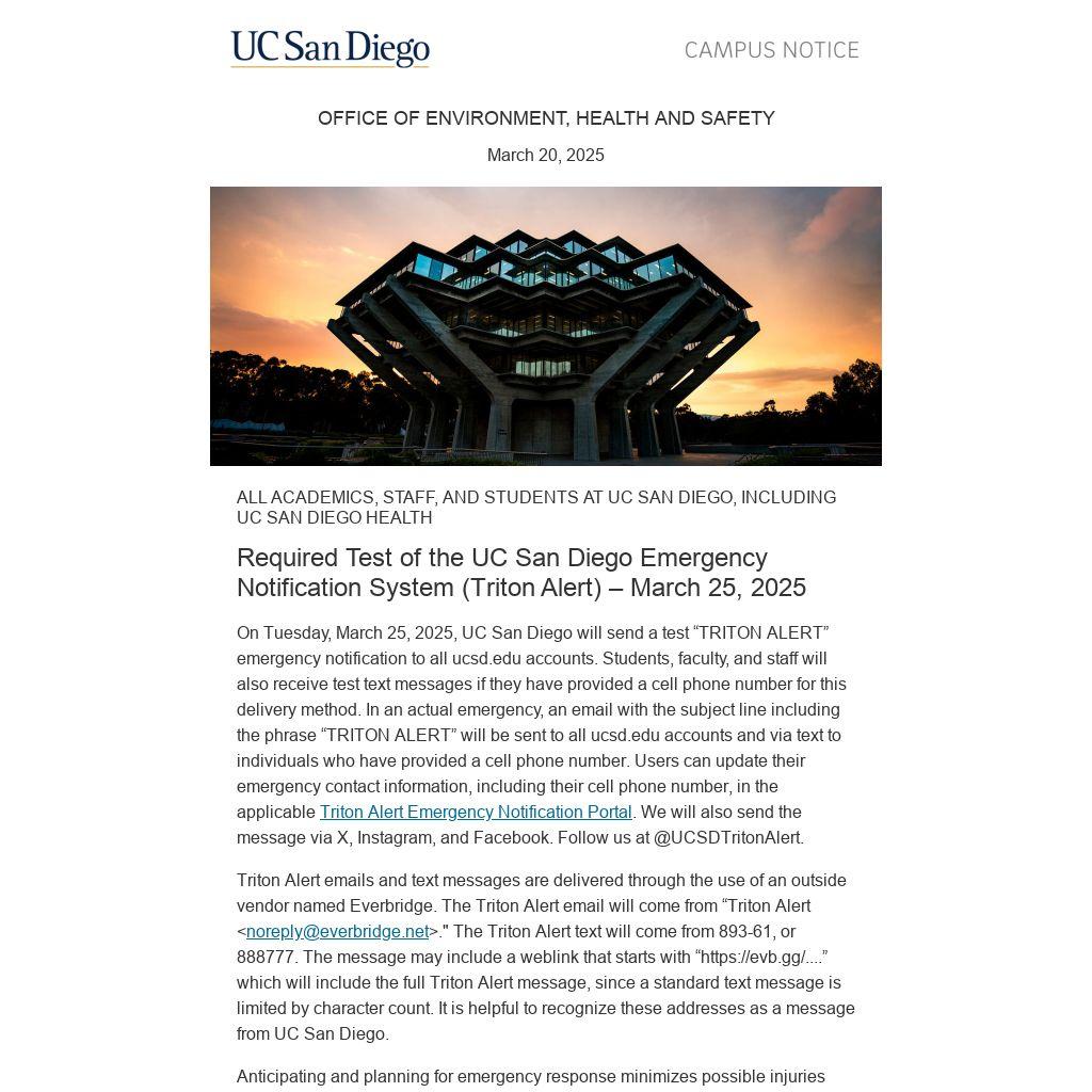 On Tuesday, March 25, 2025, UC San Diego will send a test “TRITON ALERT” emergency notification to all ucsd.edu accounts. Students, faculty, and staff will also receive test text messages if they have provided a cell phone number for this delivery method. In an actual emergency, an email with the subject line including the phrase “TRITON ALERT” will be sent to all ucsd.edu accounts and via text to individuals who have provided a cell phone number. Users can update their emergency contact information, including their cell phone number, in the applicable Triton Alert Emergency Notification Portal. We will also send the message via X, Instagram, and Facebook. Follow us at @UCSDTritonAlert.