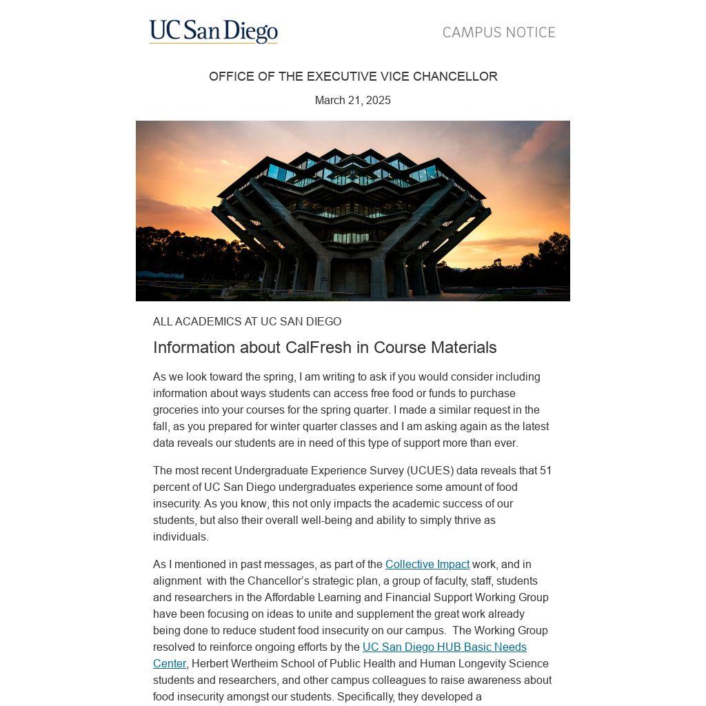 As I mentioned in past messages, as part of the Collective Impact work, and in alignment with the Chancellor’s strategic plan, a group of faculty, staff, students and researchers in the Affordable Learning and Financial Support Working Group have been focusing on ideas to unite and supplement the great work already being done to reduce student food insecurity on our campus. The Working Group resolved to reinforce ongoing efforts by the UC San Diego HUB Basic Needs Center, researchers and students in the Herbert Wertheim School of Public Health and Human Longevity Science, the Center for Community Health, the Altman Clinical and Translational Research Institute and other campus colleagues to raise awareness about food insecurity amongst our students. Specifically, they developed a communications plan to boost awareness of and applications to CalFresh, California’s food stamps (SNAP) program. A key element is asking academic instructors and mentors like you to help get the word out among your students.