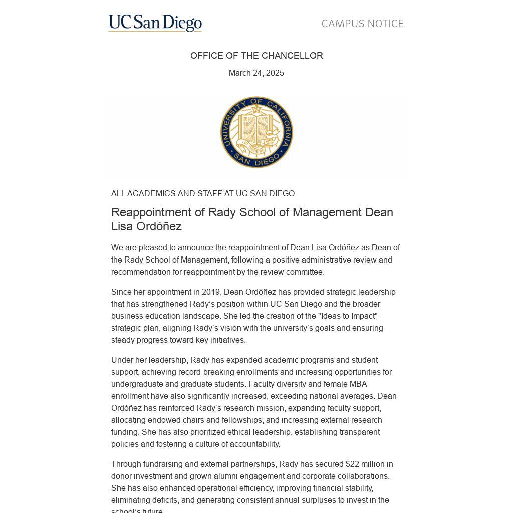 Please join us in recognizing Dean Ordóñez for her numerous accomplishments and continued service. We look forward to her ongoing leadership guiding the Rady School of Management at UC San Diego.