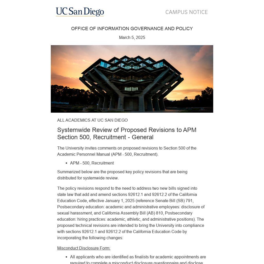 The University invites comments on proposed revisions to Section 500 of the Academic Personnel Manual (APM - 500, Recruitment).