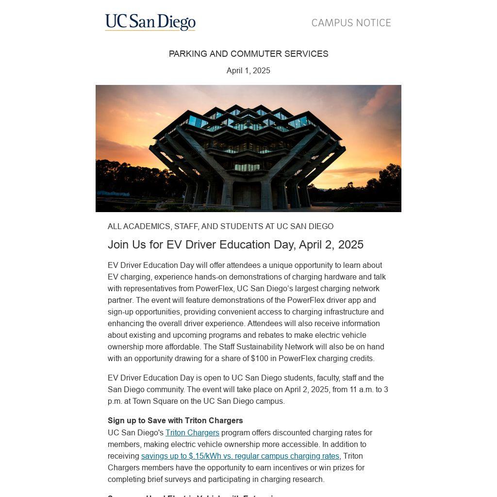 EV Driver Education Day is open to UC San Diego students, faculty, staff and the San Diego community. The event will take place on April 2, 2025, from 11 a.m. to 3 p.m. at Town Square on the UC San Diego campus.