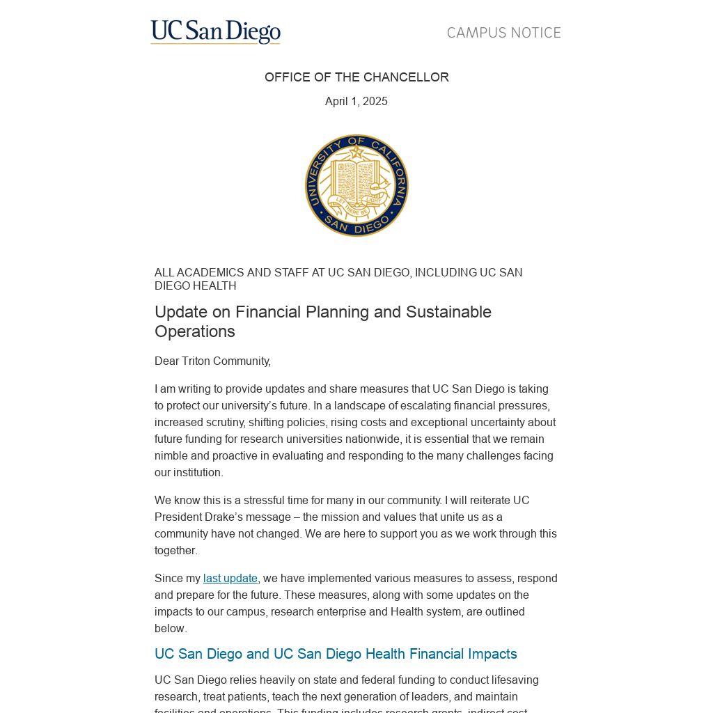 I am writing to provide updates and share measures that UC San Diego is taking to protect our university’s future. In a landscape of escalating financial pressures, increased scrutiny, shifting policies, rising costs and exceptional uncertainty about future funding for research universities nationwide, it is essential that we remain nimble and proactive in evaluating and responding to the many challenges facing our institution.
