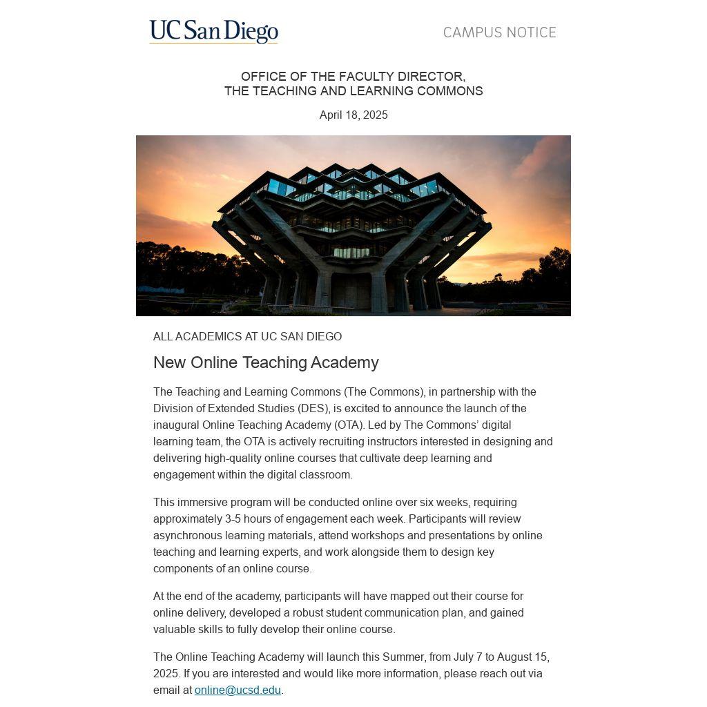 The Online Teaching Academy will launch this Summer, from July 7 to August 15, 2025. If you are interested and would like more information, please reach out via email at online@ucsd.edu.