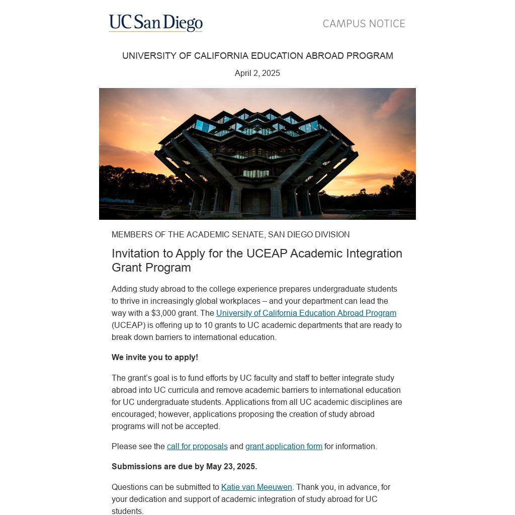The grant’s goal is to fund efforts by UC faculty and staff to better integrate study abroad into UC curricula and remove academic barriers to international education for UC undergraduate students. Applications from all UC academic disciplines are encouraged; however, applications proposing the creation of study abroad programs will not be accepted.