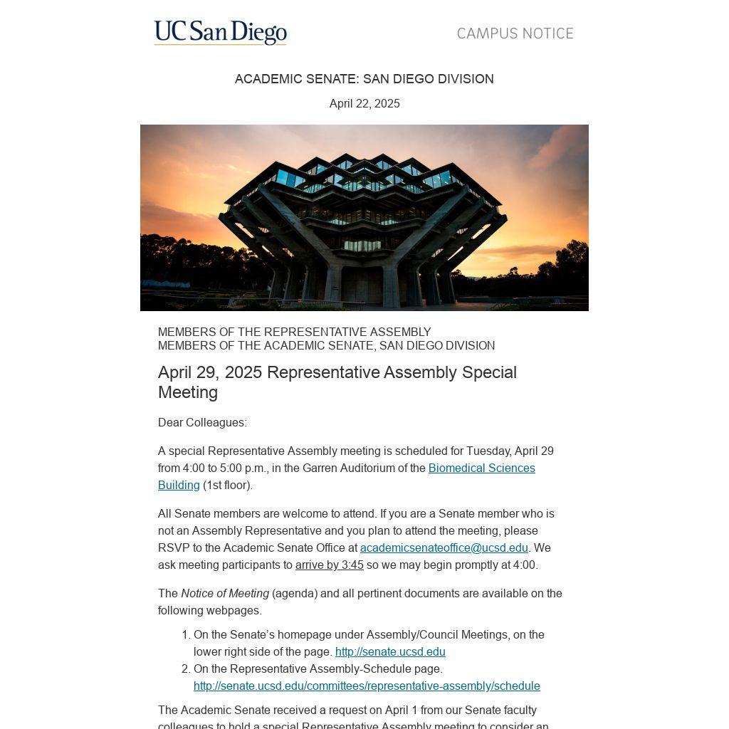 The Academic Senate received a request on April 1 from our Senate faculty colleagues to hold a special Representative Assembly meeting to consider an Academic Senate response and actions to: 1. Help Safeguard Our Students and Faculty; and 2. Stand Up for Free Speech and Academic Freedom. Two resolutions related to the first topic were passed at a special Assembly meeting on April 15. A proposed Resolution to Defend UC San Diego’s Commitment to Free Speech and Academic Freedom will be considered at this special meeting.
