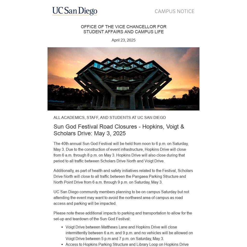 Sun God Festival Road Closures - Hopkins, Voigt & Scholars Drive: May 3, 2025 |
