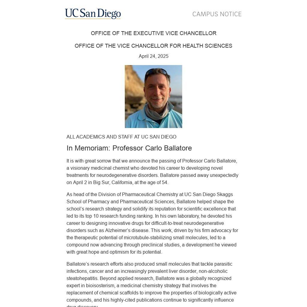 As head of the Division of Pharmaceutical Chemistry at UC San Diego Skaggs School of Pharmacy and Pharmaceutical Sciences, Ballatore helped shape the school’s research strategy and solidify its reputation for scientific excellence that led to its top 10 research funding ranking. In his own laboratory, he devoted his career to designing innovative drugs for difficult-to-treat neurodegenerative disorders such as Alzheimer’s disease. This work, driven by his firm advocacy for the therapeutic potential of microtubule-stabilizing small molecules, led to a compound now advancing through preclinical studies, a development he viewed with great hope and optimism for its potential.