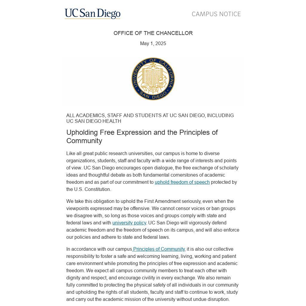 We take this obligation to uphold the First Amendment seriously, even when the viewpoints expressed may be offensive. We cannot censor voices or ban groups we disagree with, so long as those voices and groups comply with state and federal laws and with university policy. UC San Diego will vigorously defend academic freedom and the freedom of speech on its campus, and will also enforce our policies and adhere to state and federal laws.