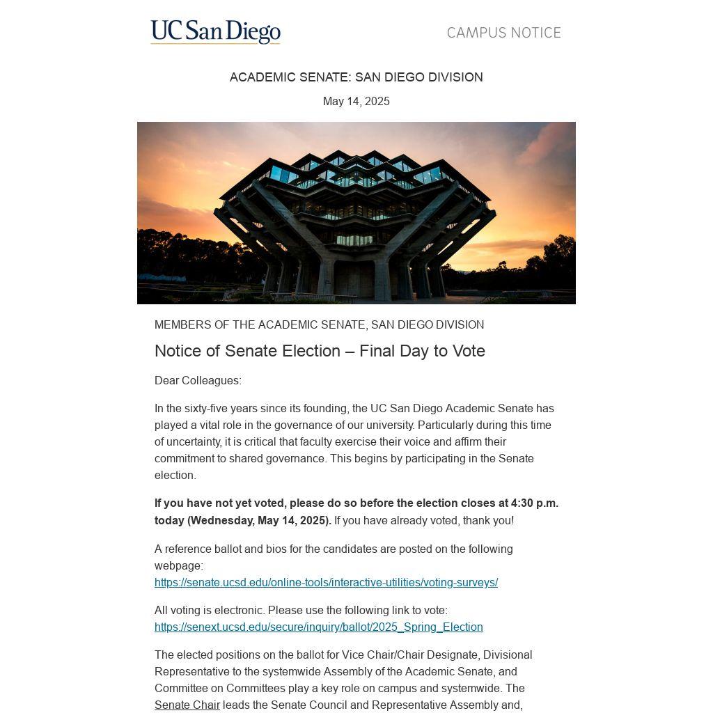 In the sixty-five years since its founding, the UC San Diego Academic Senate has played a vital role in the governance of our university. Particularly during this time of uncertainty, it is critical that faculty exercise their voice and affirm their commitment to shared governance. This begins by participating in the Senate election.