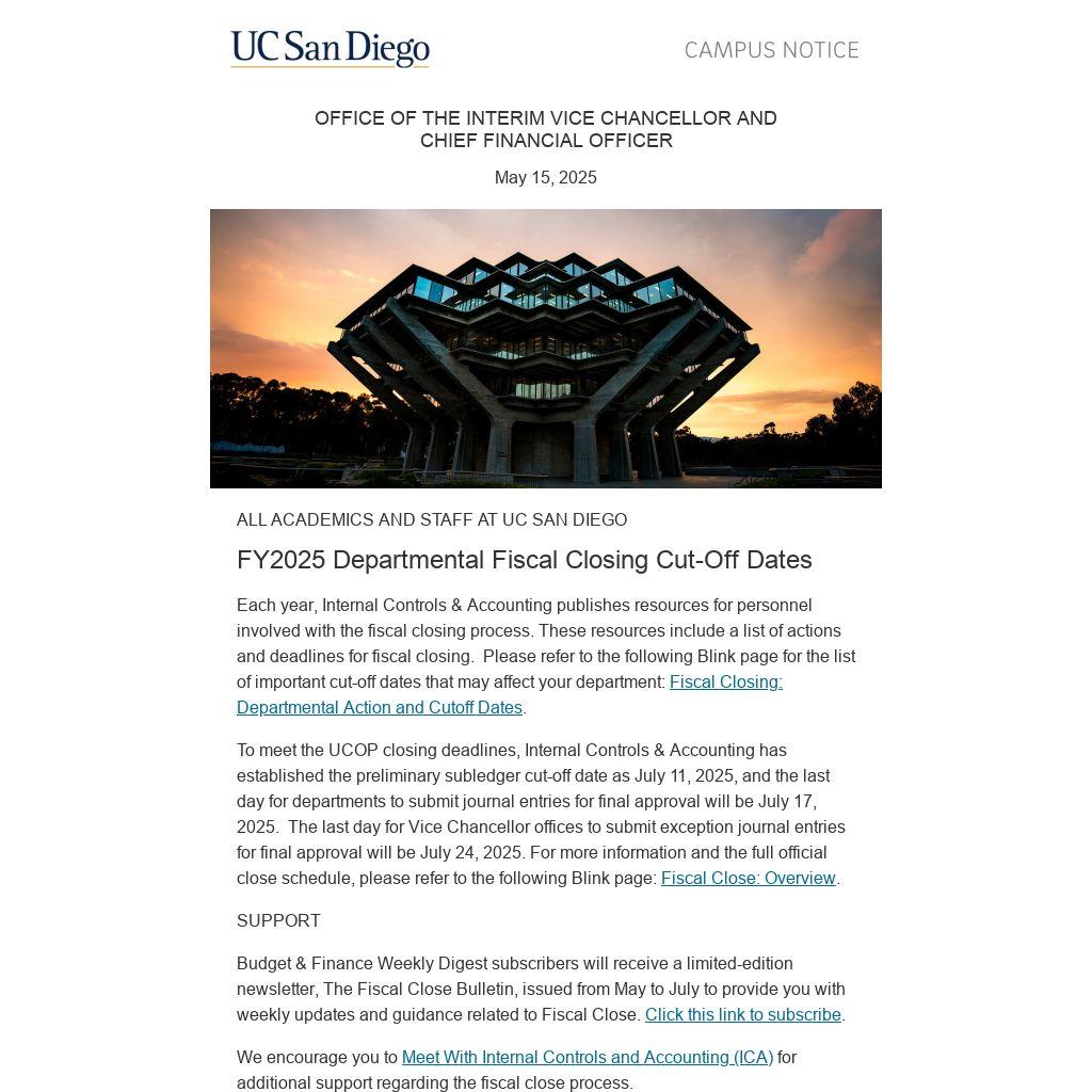 To meet the UCOP closing deadlines, Internal Controls & Accounting has established the preliminary subledger cut-off date as July 11, 2025, and the last day for departments to submit journal entries for final approval will be July 17, 2025. The last day for Vice Chancellor offices to submit exception journal entries for final approval will be July 24, 2025. For more information and the full official close schedule, please refer to the following Blink page: Fiscal Close: Overview.