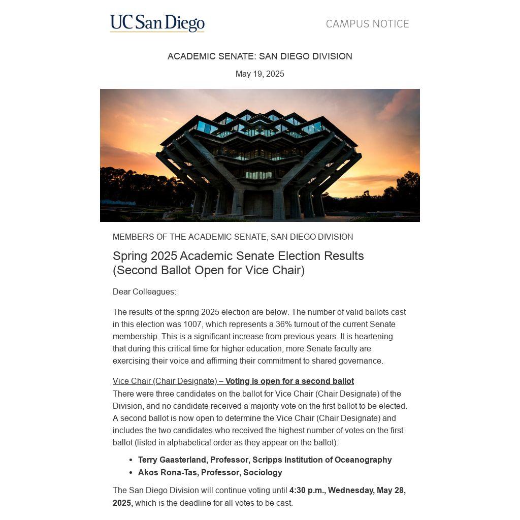 Spring 2025 Academic Senate Election Results (Second Ballot Open for Vice Chair) |