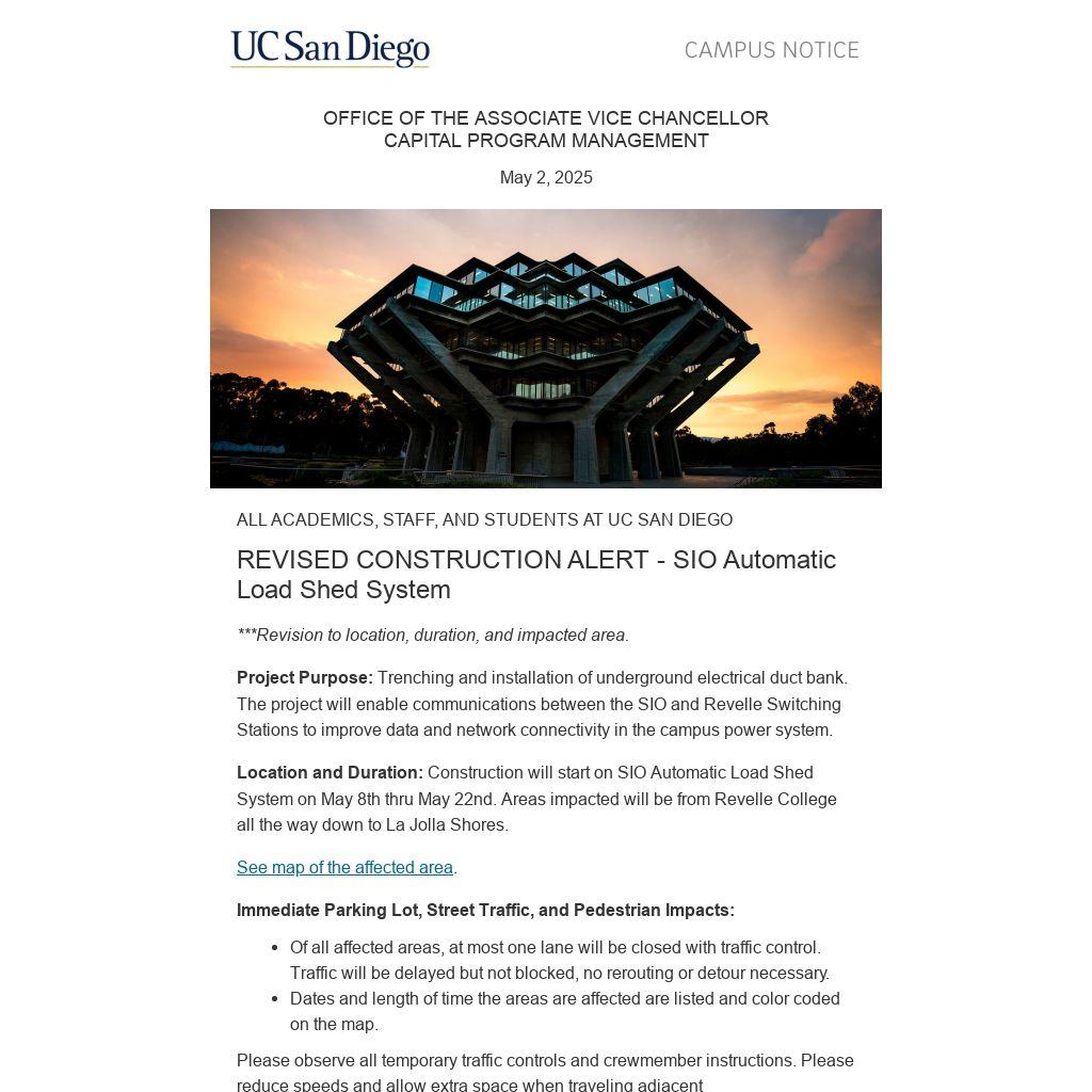 Location and Duration: Construction will start on SIO Automatic Load Shed System on May 8th thru May 22nd. Areas impacted will be from Revelle College all the way down to La Jolla Shores.