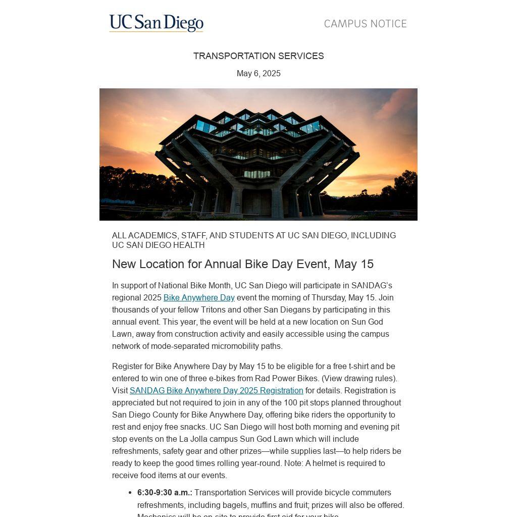 In support of National Bike Month, UC San Diego will participate in SANDAG’s regional 2025 Bike Anywhere Day event the morning of Thursday, May 15. Join thousands of your fellow Tritons and other San Diegans by participating in this annual event. This year, the event will be held at a new location on Sun God Lawn, away from construction activity and easily accessible using the campus network of mode-separated micromobility paths.