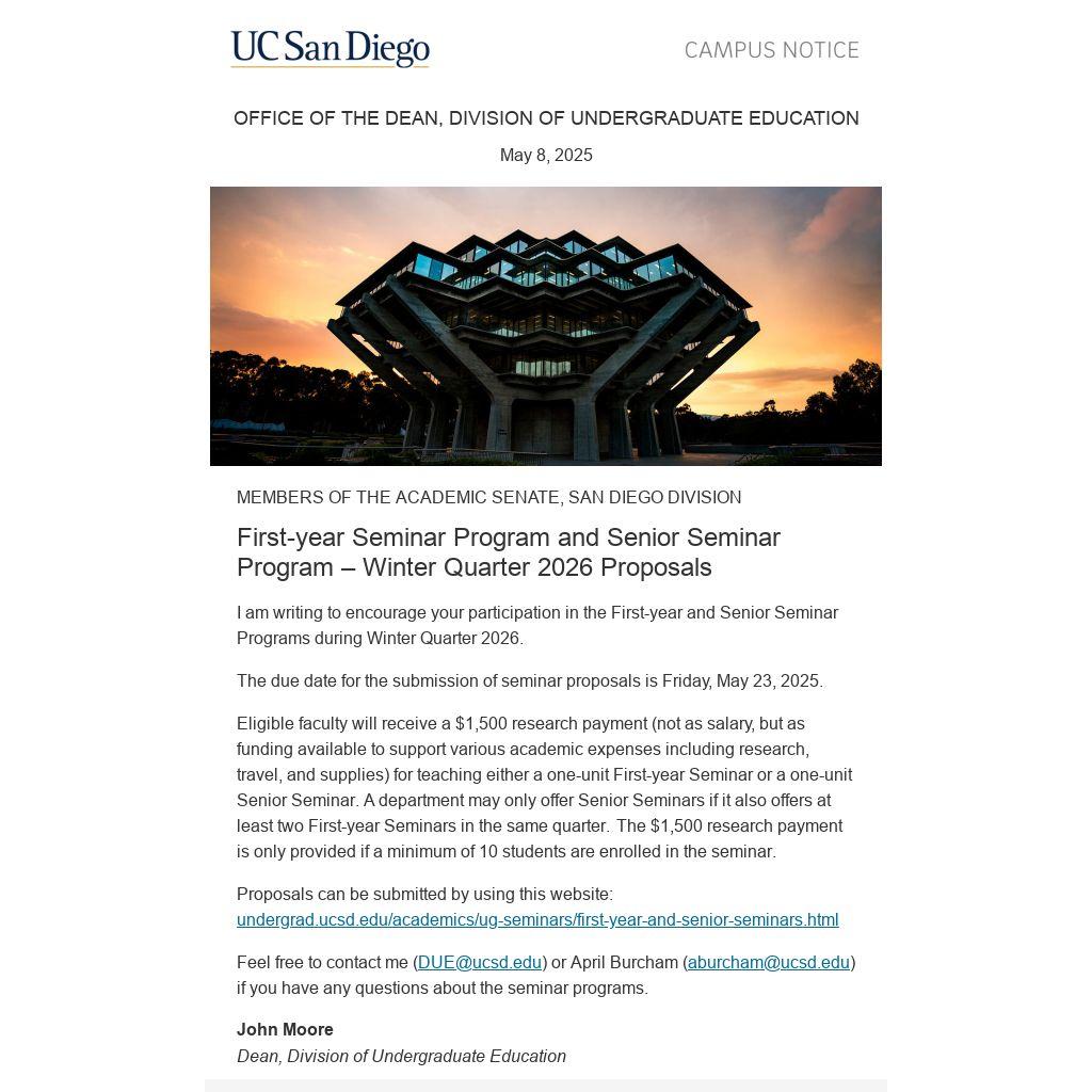 Feel free to contact me (DUE@ucsd.edu) or April Burcham (aburcham@ucsd.edu) if you have any questions about the seminar programs.