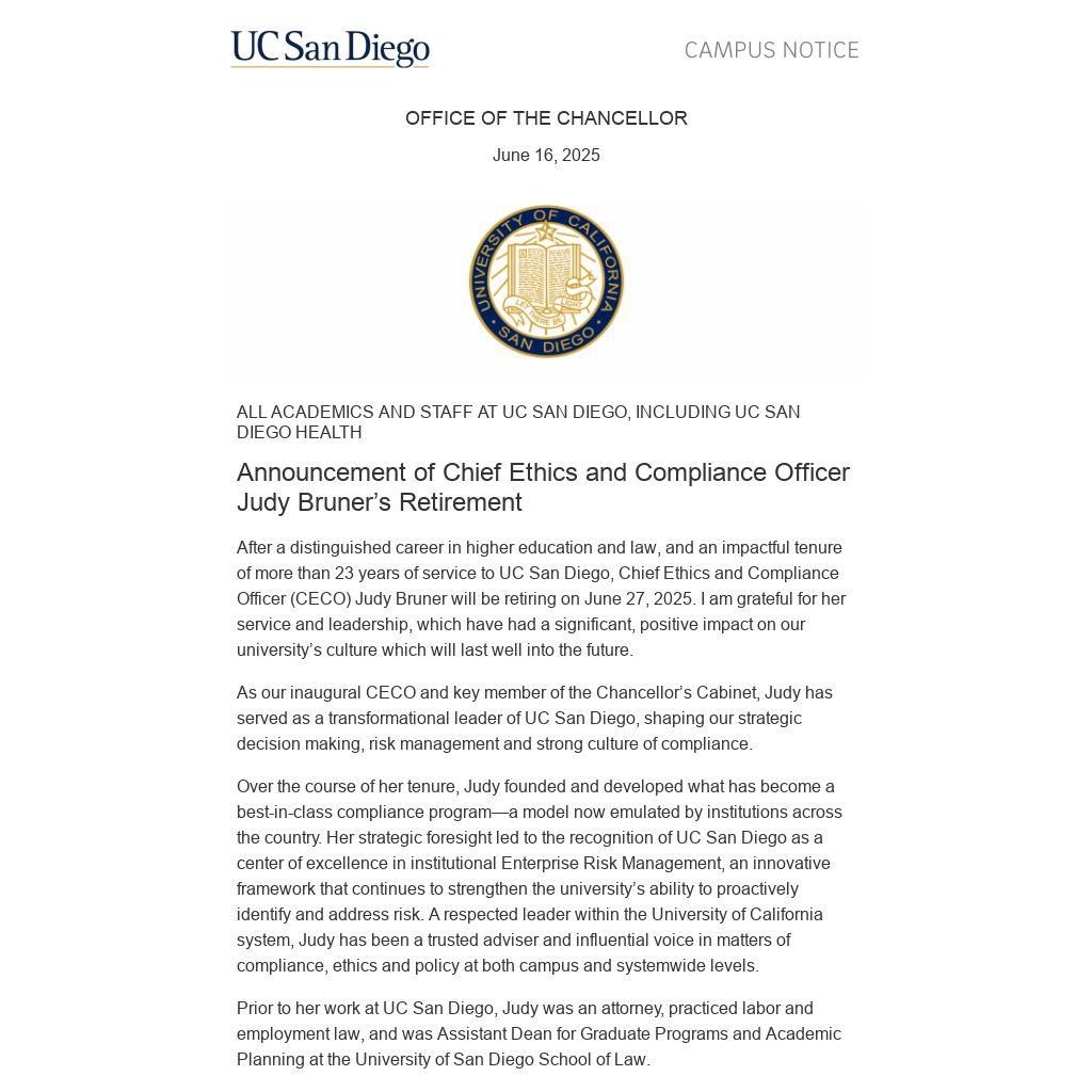 After a distinguished career in higher education and law, and an impactful tenure of more than 23 years of service to UC San Diego, Chief Ethics and Compliance Officer (CECO) Judy Bruner will be retiring on June 27, 2025. I am grateful for her service and leadership, which have had a significant, positive impact on our university’s culture which will last well into the future.
